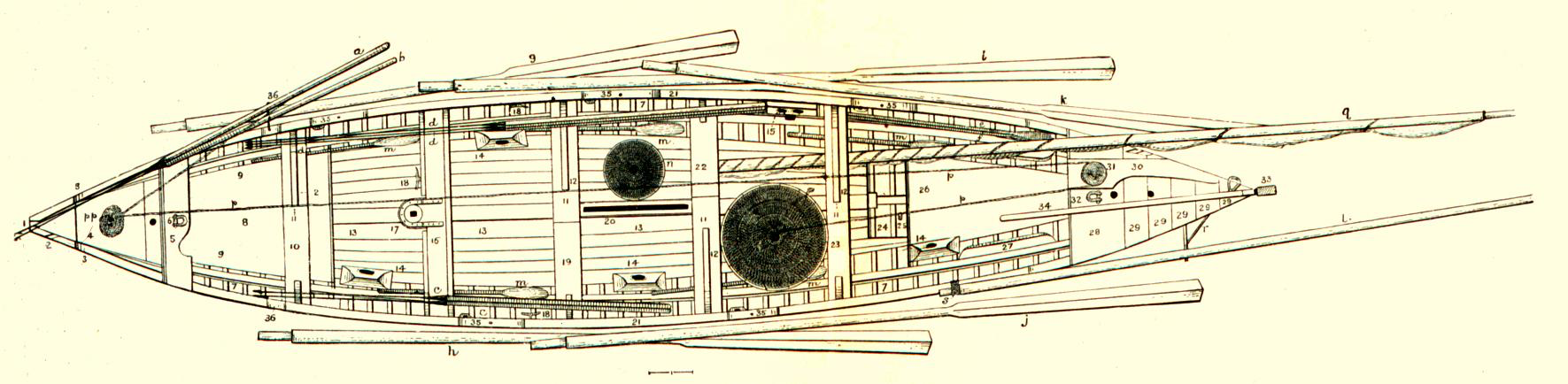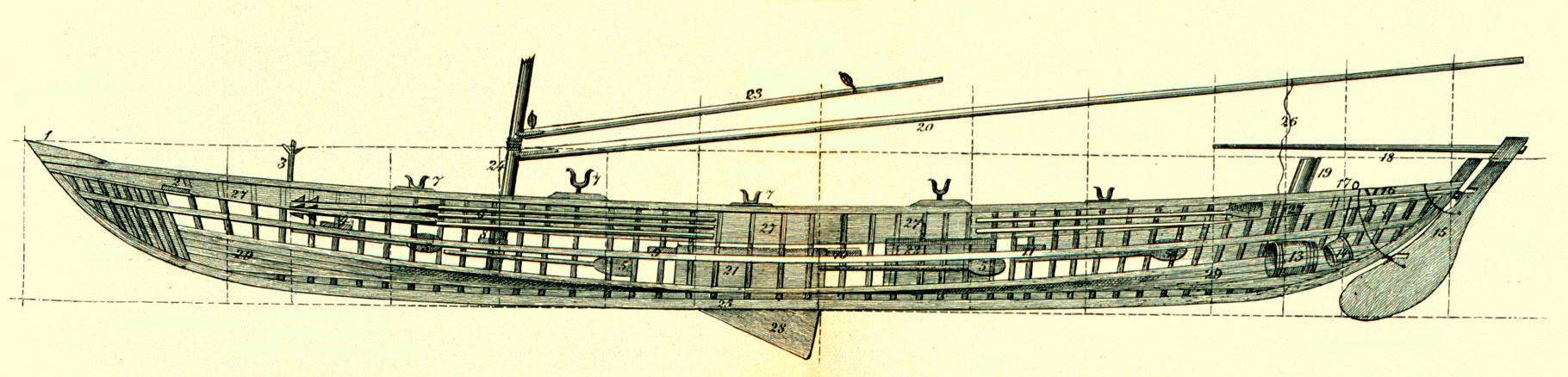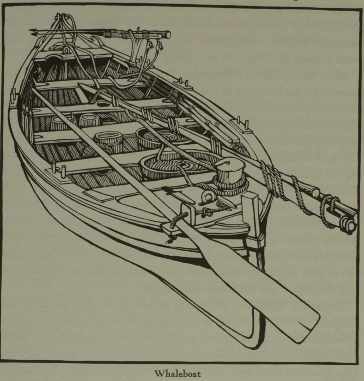 Before lowering the boat for the chase, the upper end of the line is taken aft from the tub, and passing round the loggerhead12 there, is again carried forward the entire length of the boat, resting crosswise upon the loom or handle of every man’s oar, so that it jogs against his wrist in rowing; and also passing between the men, as they alternately sit at the opposite gunwales, to the leaded chocks13 or grooves in the extreme pointed prow of the boat, where a wooden pin or skewer the size of a common quill, prevents it from slipping out. From the chocks it hangs in a slight festoon14 over the bows, and is then passed inside the boat again; and some ten or twenty fathoms (called box-line15) being coiled upon the box in the bows, it continues its way to the gunwale still a little further aft, and is then attached to the short-warp—the rope which is immediately connected with the harpoon; but previous to that connection, the short-warp goes through sundry mystifications too tedious to detail.16