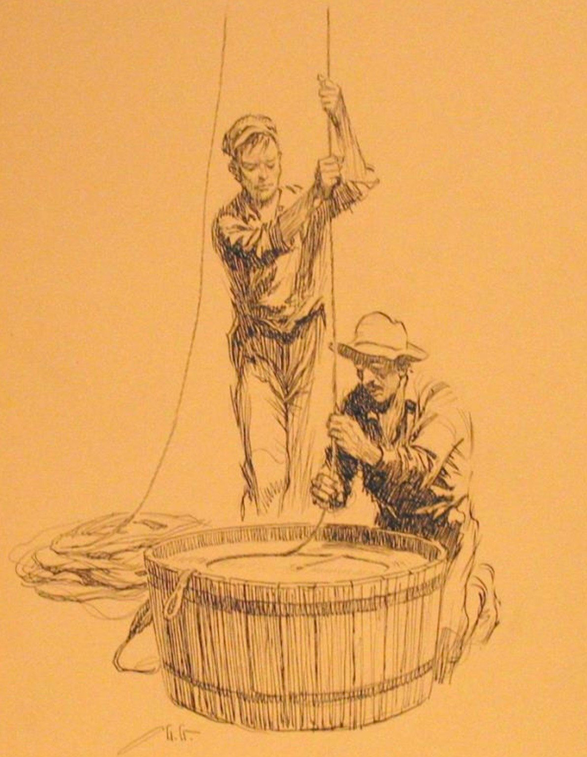 The whale-line is only two-thirds of an inch in thickness. At first sight, you would not think it so strong as it really is. By experiment its one and fifty yarns will each suspend a weight of one hundred and twenty pounds;4 so that the whole rope will bear a strain nearly equal to three tons. In length, the common sperm whale-line measures something over two hundred fathoms.5 Towards the stern of the boat it is spirally coiled away in the tub, not like the worm-pipe of a still6 though, but so as to form one round, cheese-shaped mass7 of densely bedded “sheaves,”8 or layers of concentric spiralizations, without any hollow but the “heart,” or minute vertical tube [BJ says line] formed at the axis of the cheese. As the least tangle or kink in the coiling would, in running out, infallibly take somebody’s arm, leg, or entire body off, the utmost precaution is used in stowing the line in its tub. Some harpooneers will consume almost an entire morning in this business, carrying the line high aloft and then reeving9 it downwards through a block towards the tub, so as in the act of coiling to free it from all possible wrinkles and twists.