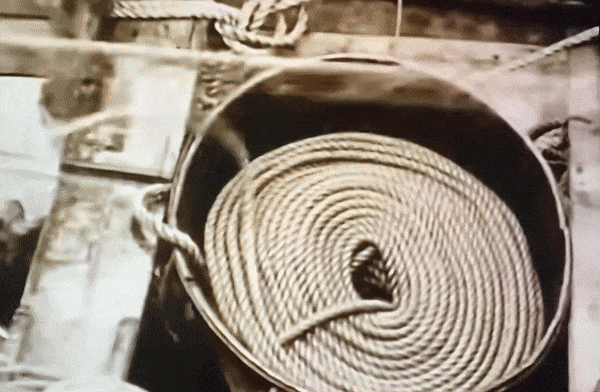 1920s whaling line feeding out Footage from Down to the Sea In Ships of a fast line paying out while someone splashes water on it off camera. (just like in Jaws!)
