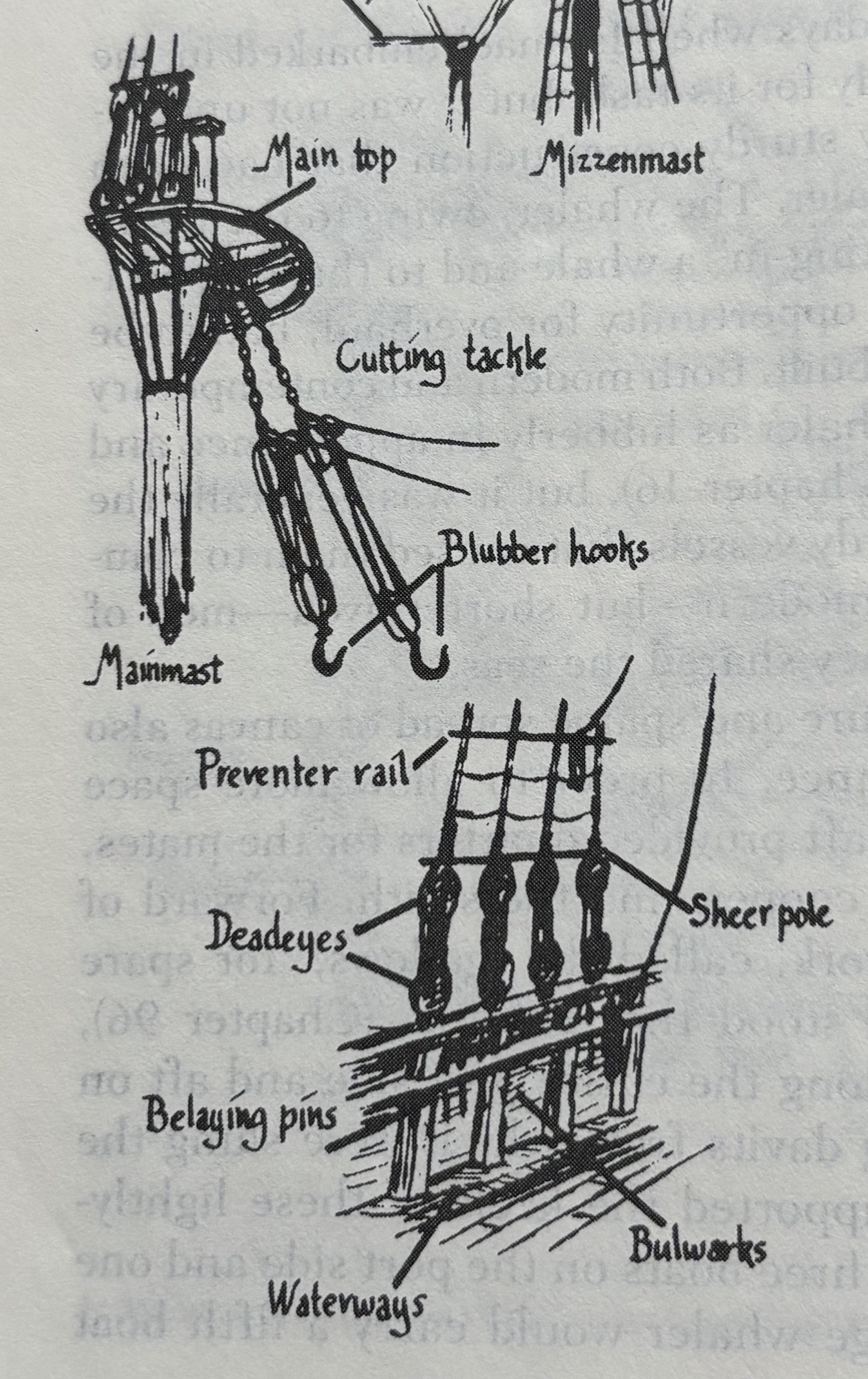 Cutting tackle: a pulley device used to hoist strips of blubber as they are cut off a whale ↩