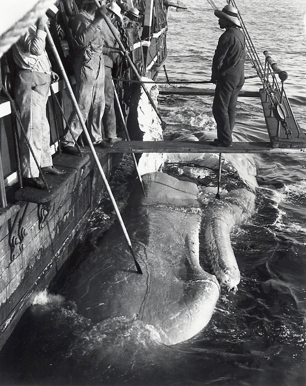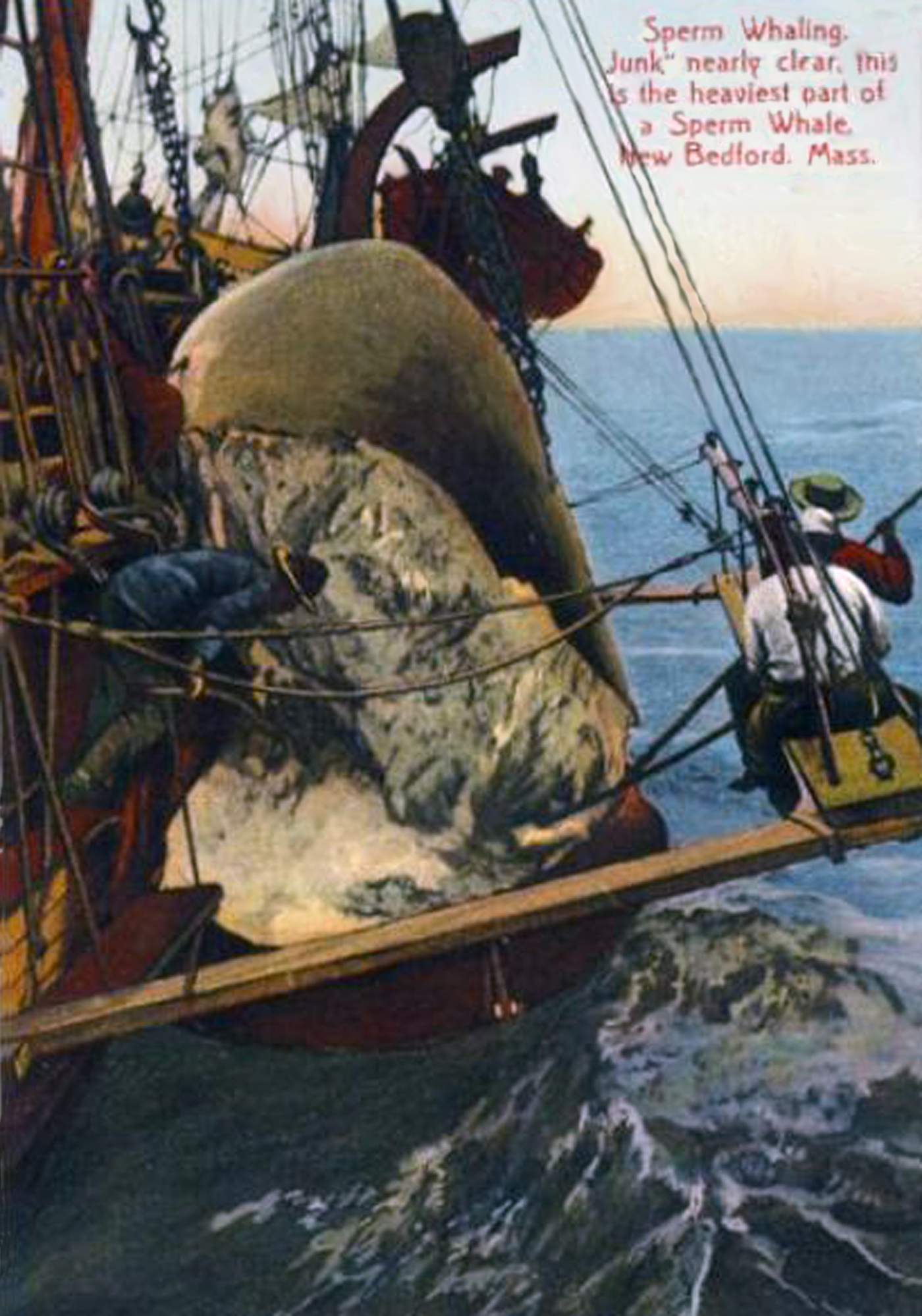 The Pequod’s whale being decapitated and the body stripped, the head was hoisted against the ship’s side—about half way out of the sea, so that it might yet in great part be buoyed up by its native element. And there with the strained craft steeply leaning over to it, by reason of the enormous downward drag from the lower mast-head, and every yard-arm on that side projecting like a crane over the waves; there, that blood-dripping head hung to the Pequod’s waist like the giant Holofernes’s from the girdle of Judith.30