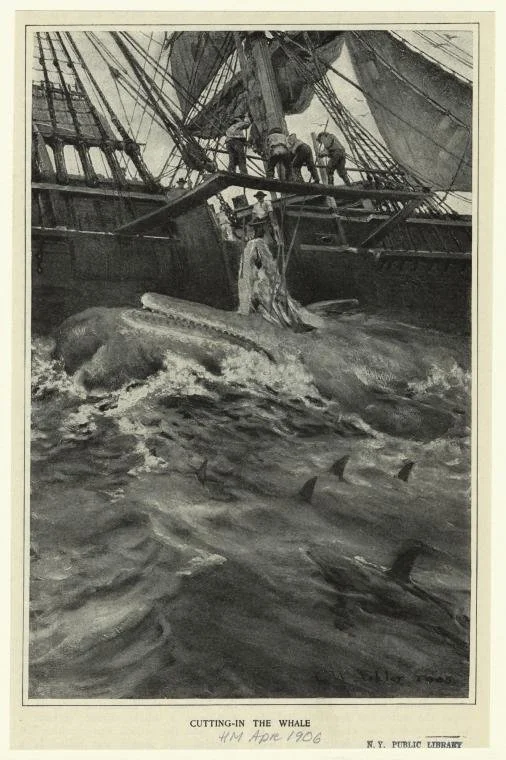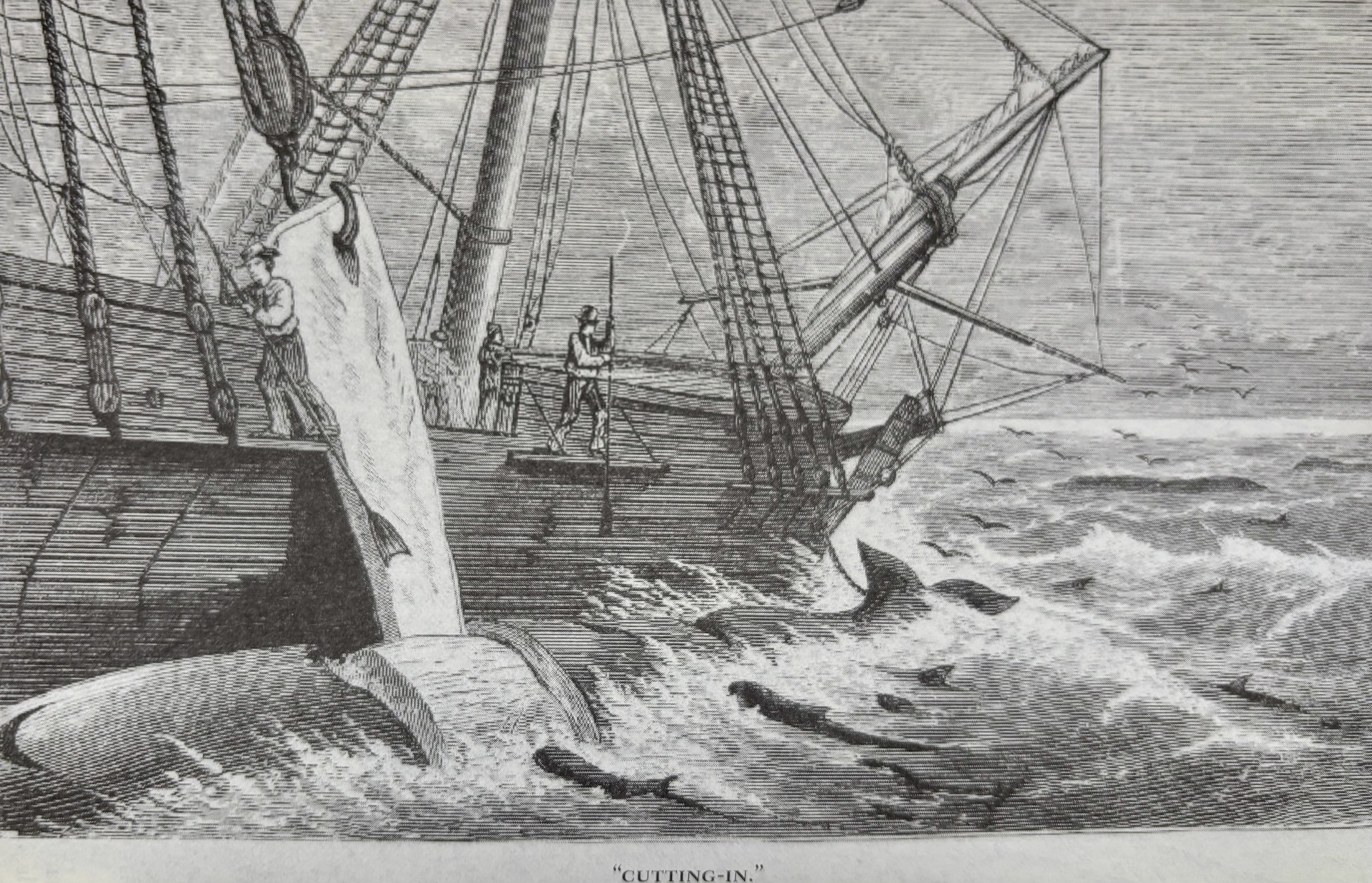 And now suspended in stages over the side, Starbuck and Stubb, the mates, armed with their long spades, began cutting a hole in the body for the insertion of the hook just above the nearest of the two side-fins. This done, a broad, semicircular line is cut round the hole, the hook is inserted, and the main body of the crew striking up a wild chorus, now commence heaving in one dense crowd at the windlass. When instantly, the entire ship careens over on her side; every bolt in her starts like the nail-heads of an old house in frosty weather; she trembles, quivers, and nods her frighted mast-heads to the sky. More and more she leans over to the whale, while every gasping heave of the windlass is answered by a helping heave from the billows; till at last, a swift, startling snap is heard; with a great swash the ship rolls upwards and backwards from the whale, and the triumphant tackle rises into sight dragging after it the disengaged semicircular end of the first strip of blubber. Now as the blubber envelopes the whale precisely as the rind does an orange, so is it stripped off from the body precisely as an orange is sometimes stripped by spiralizing it. For the strain constantly kept up by the windlass continually keeps the whale rolling over and over in the water, and as the blubber in one strip uniformly peels off along the line called the “scarf,” simultaneously cut by the spades of Starbuck and Stubb, the mates;